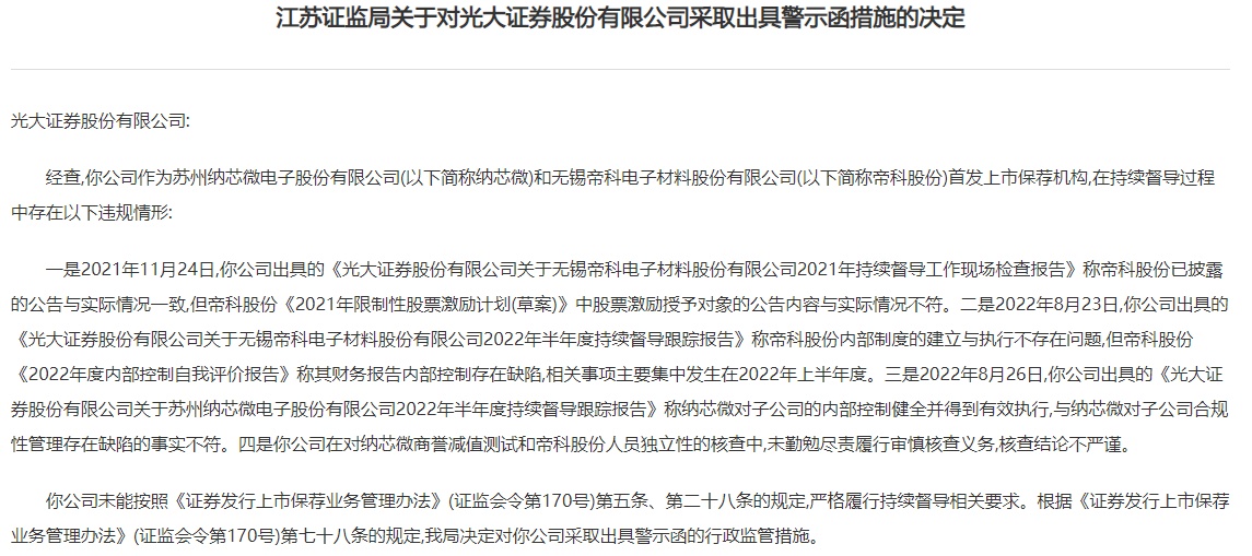 智通财经APP获悉,6月6日,江苏证监局公告称,光大证券(06178)作为纳芯微(688052.SH)和帝科股份(300842.SZ)首发上市保荐机构,在持续督导过程中未能按照有关规定,严格履行持续督导相关要求。江苏证监局决定对光大证券采取出具警示函的行政监管措施。