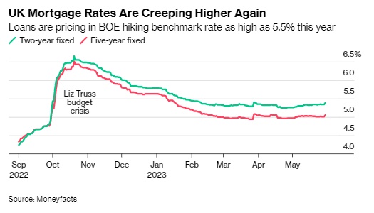 在前首相特拉斯的激进经济计划出台后,去年秋季抵押贷款利率达到了14年来的最高点,此后一直在下降,但随着投资者押注英国央行将继续加息以消除粘性通胀,抵押贷款利率又开始攀升。
