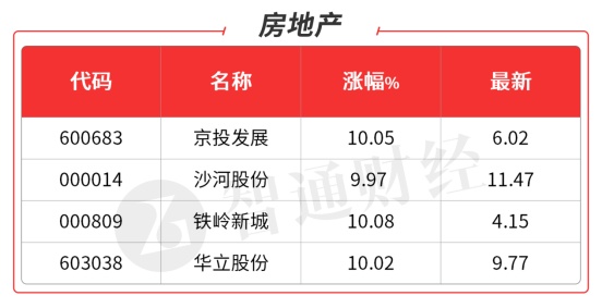 今天地产行业出了小作文。板块集体拉升,京投发展(300683.SZ)、华立股份(603038.SH)均3天2板;铁岭新城(000809.SZ)、沙河股份(000014.SZ)等均涨停。在地产股拉升刺激下,家居建材方向跟随活跃,中天精装(002989.SZ)、华立股份(603038.SH),箭牌家居(001322.SZ)均封板。