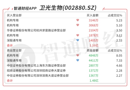 卫光生物(002880.SZ):受到众多机构青睐,今日共3家机构席位出现在龙虎榜单上,对倒合计净买入3244万元,深股通对倒卖出3006万元,当日净卖出3217万元,该股突破近2年平台,持续上升需放量。