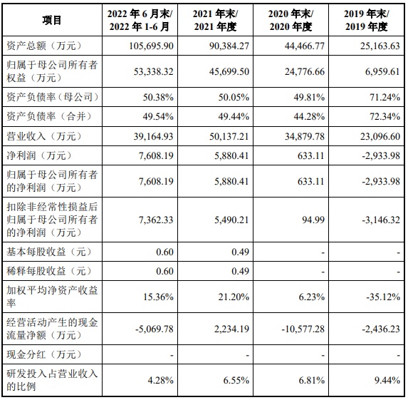 财务方面,与2019年度、2020年度、2021年度以及2022年1-6月,公司实现营业收入分别为2.31亿元、3.49亿元、5.01亿元、3.92亿元。其中,公司实现净利润分别为-2933.98万元、633.11万元、5880.41万元、7608.19万元。
