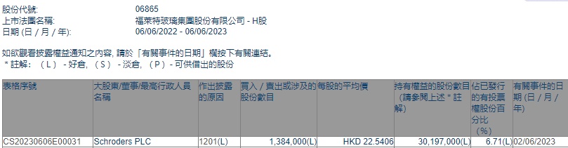PLC减持福莱特玻璃(06865)138.4万股,每股作价22.5406港元,总金额约为3119.62万港元。减持后最新持股数目为3019.7万股,最新持股比例为6.71%。