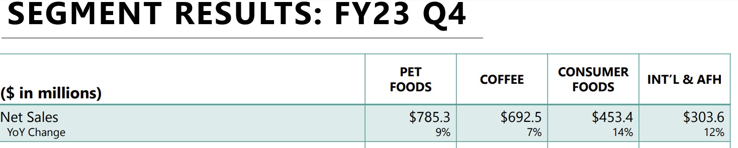 智通财经APP获悉,美国包装食品零售巨头斯马克(SJM.US)于周二美股盘前公布了截至2023年4月30日的2023财年第四季度财报。财报数据显示,斯马克Q4净销售额为22.3亿美元,较上年同期增长10%,Q4调整后的每股收益(EPS)为2.64美元,上年同期为2.23美元。净销售额与调整后每股收益的分析师普遍预期分别为21.7亿美元与2.41美元,两项数据均超出预期。
