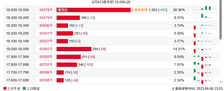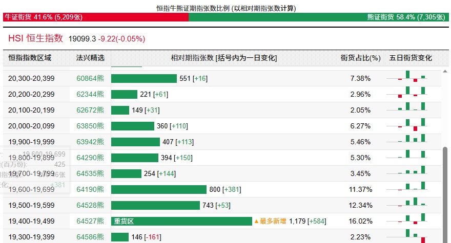 法兴恒指牛熊证街货分布图中的数据显示,熊证街货重货区和最多新增都在19400-19499区间,该区间最新熊证数量为1179张,较上一交易日增加584张。