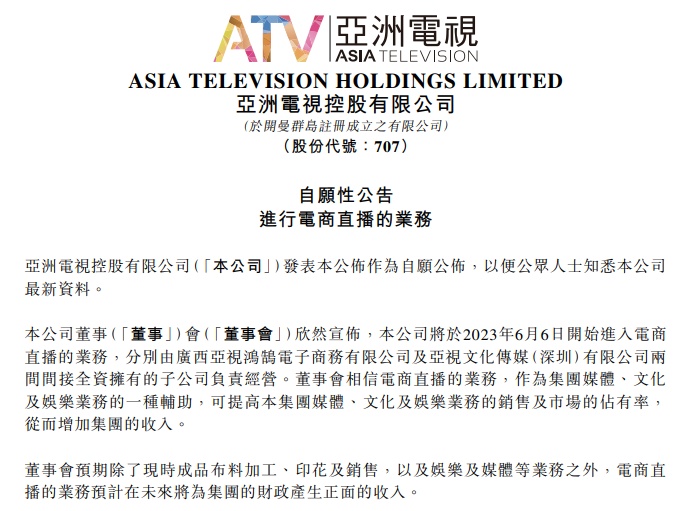 亚视董事会预期除了现时成品布料加工、印花及销售,以及娱乐及媒体等业务之外,电商直播的业务预计在未来将为集团的财政产生正面的收入。
