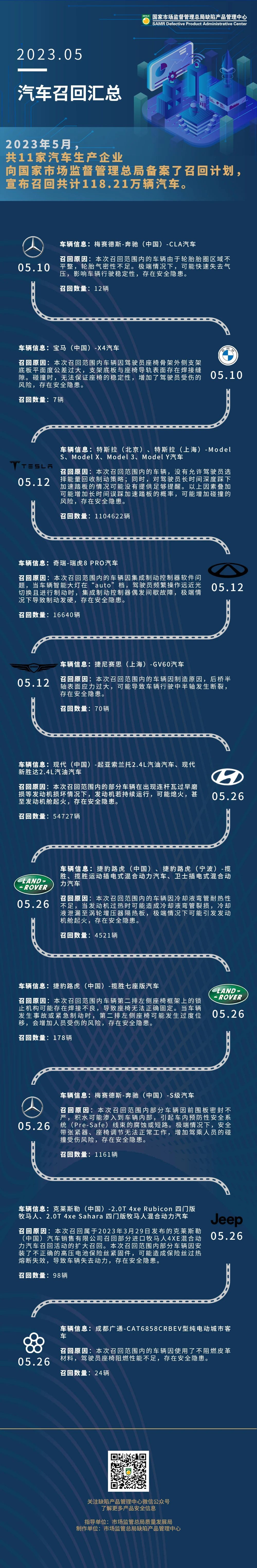 智通财经APP获悉,6月7日,据市场监管总局,5月共11家汽车生产企业向市场监管总局备案了召回计划,宣布号回共计118.21万辆汽车。其中,特斯拉(TSLA.US)共召回110.46万辆汽车,现代汽车共召回5.47万辆汽车,梅赛德斯奔驰共召回1161辆汽车。