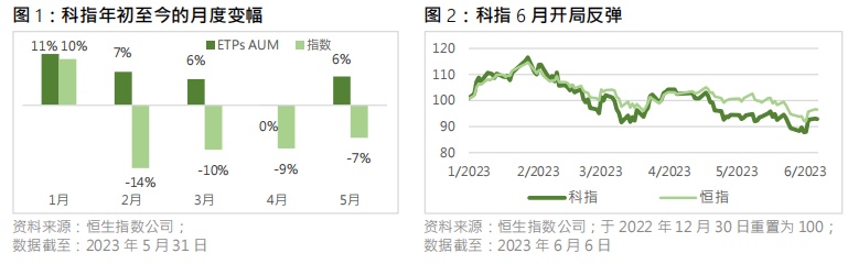 恒指公司指出,2023年前5个月,科技股表现疲弱,科指更录得逾12%的跌幅,主要是受累地缘紧张政治形势升温、美国加息。尽管大市受压,年初以来追踪科指的ETP却见大量资金流入,截至今年5月底,这些ETP的AUM已经达到131亿美元,较去年底的98亿美元急升34%。图1显示,在今年首5个月,科指ETP的AUM在每一个月内均录得高于指数的升幅或小于指数的跌幅,由此可见投资者正在持续增加科指ETP的持仓。