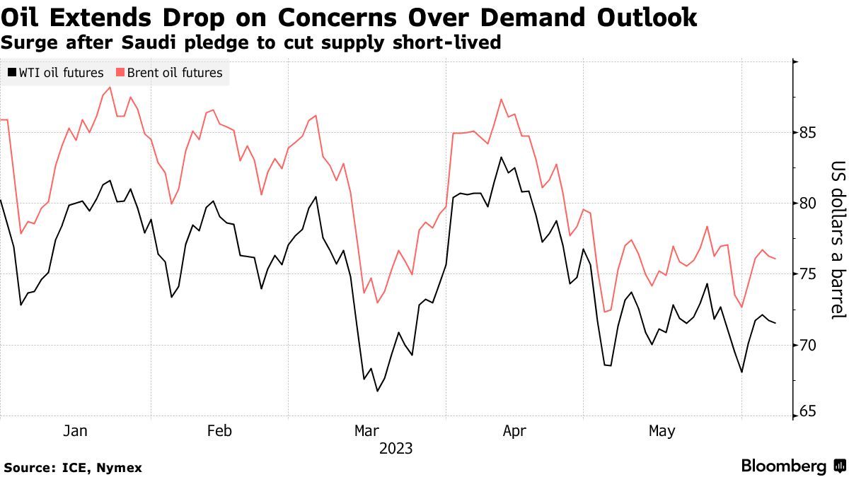 智通财经APP了解到,由于大宗商品交易员们对原油需求前景的持续担忧情绪,国际油价今日继续下跌。在上周末,沙特阿拉伯承诺进一步削减供应——沙特将在7月份额外削减100万桶/日原油供应,使其产量降至几年来的最低水平,这一消息也使得国际油价在周一出现小幅度反弹。然而,周二油价迈向下跌,今日更是延续跌势。