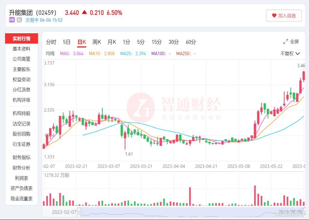 6月6日盘中,升能集团股价再度快速拉升,一度创出3.46港元的上市新高,较4月收盘的1.79港元最高上涨93.3%。