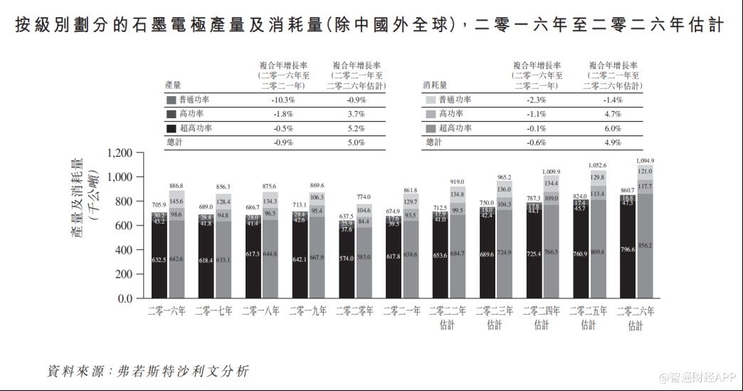 长期来看,石墨电极的需求也不太容易出现爆发式增长的情形。据弗若斯特沙利文报告,2016年至2021年,除中国之外的全球石墨电极产量由71万吨减少至67万吨,复合年增长率为–0.9%。未来,随着电弧炉炼钢行业的复苏,石墨电极市场有望恢复长期增长态势。2026年,除中国以外的全球石墨电极产量及消耗量预期将分别达到86万吨及109万吨,2021年至2026年的复合年增长率分别为5.0%及4.9%。