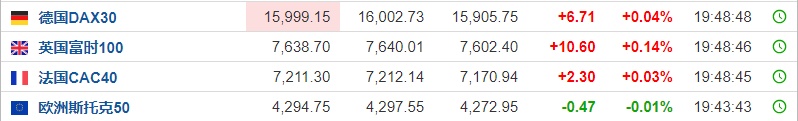 2. 截至发稿,德国DAX指数涨0.04%,英国富时100指数涨0.14%,法国CAC40指数涨0.03%,欧洲斯托克50指数跌0.01%。