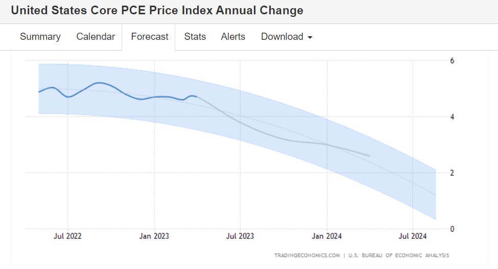虽然4月美联储最青睐的通胀指标——核心个人消费支出指数(核心PCE)超预期上行,但核心PCE以及核心CPI数据趋势显示,美国通胀率总体呈下行趋势。根据数据统计平台Trading Economics按照全球宏观模型和分析师预期汇编的预测数据,数据显示到本季度末,美国核心PCE价格指数的年变化率预计为3.80%。