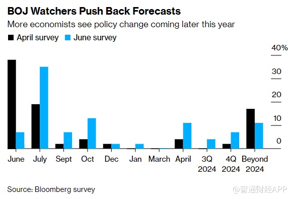 更广泛的迹象表明,政策变化的时间比此前预计的要晚,预计今年夏季过后政策会发生变化的受访者比例从4月份的调查中不到10%跃升至22%。
