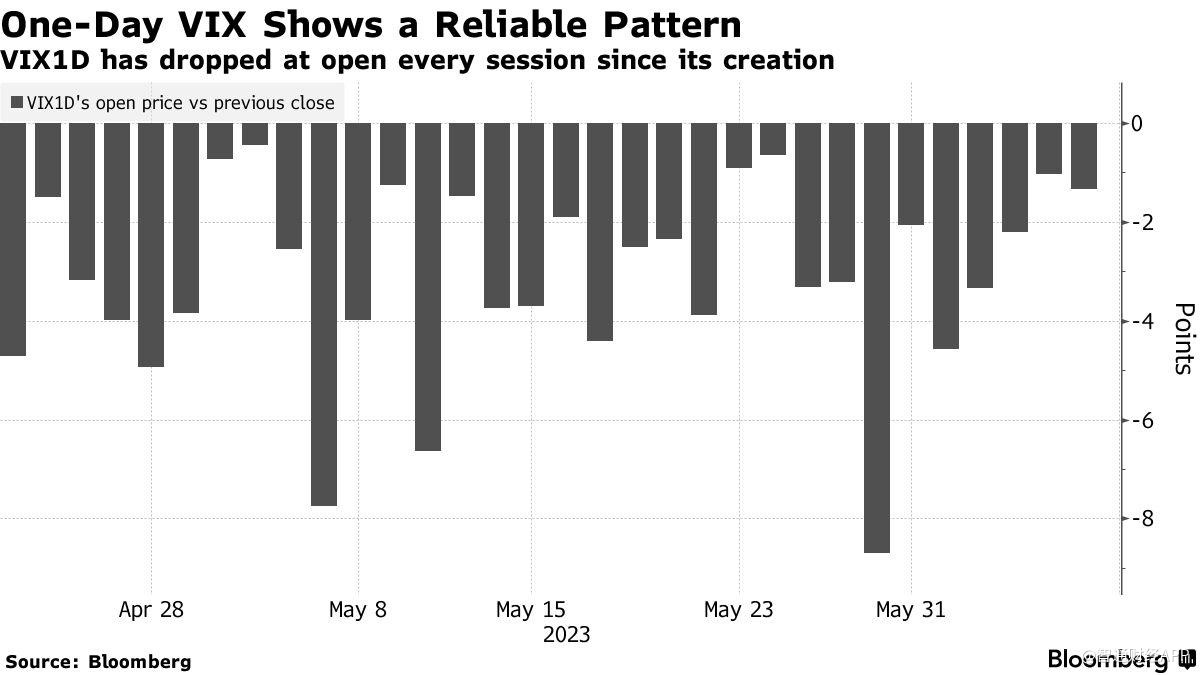 自4月底创立以来,芝加哥期权交易所单日波动率指数(VIX1D)持续低开,平均较前一收盘价下跌3.2点。
