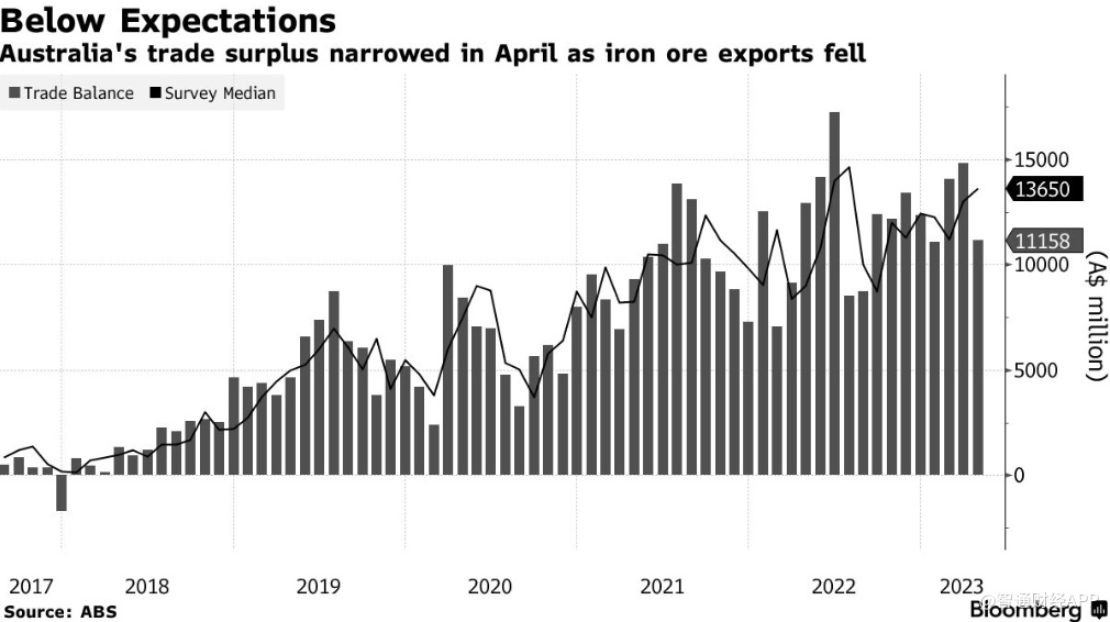 智通财经APP获悉,由于铁矿石和其他金属出口下降,进口增加,澳大利亚4月份贸易顺差收窄幅度超出预期,但仍保持健康。数据显示,澳大利亚4月商品及服务贸易帐为112亿澳元(合75亿美元),低于预期的137亿澳元。4月整体出口下降5%,进口增长2%。
