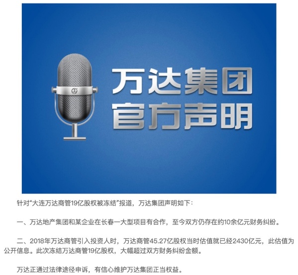 智通财经APP获悉,6月8日,针对“大连万达商管19亿股权被冻结”,万达集团通过官网发布声明称,万达地产集团和某企业在长春一大型项目有合作,至今双方仍存在约10余亿元财务纠纷。此外,2018年万达商管引入投资人时,万达商管45.27亿股权当时估值就已经2430亿元,此估值为公开信息。此次冻结万达商管19亿股权,大幅超过双方财务纠纷金额。万达集团表示,万达正通过法律途径申诉,有信心维护万达集团正当权益。