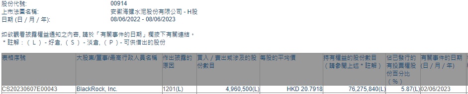 智通财经APP获悉,香港联交所最新资料显示,6月2日,贝莱德减持海螺水泥(00914)496.05万股,每股作价20.7918港元,总金额约为1.03亿港元。减持后最新持股数目约为7627.58万股,最新持股比例为5.87%。