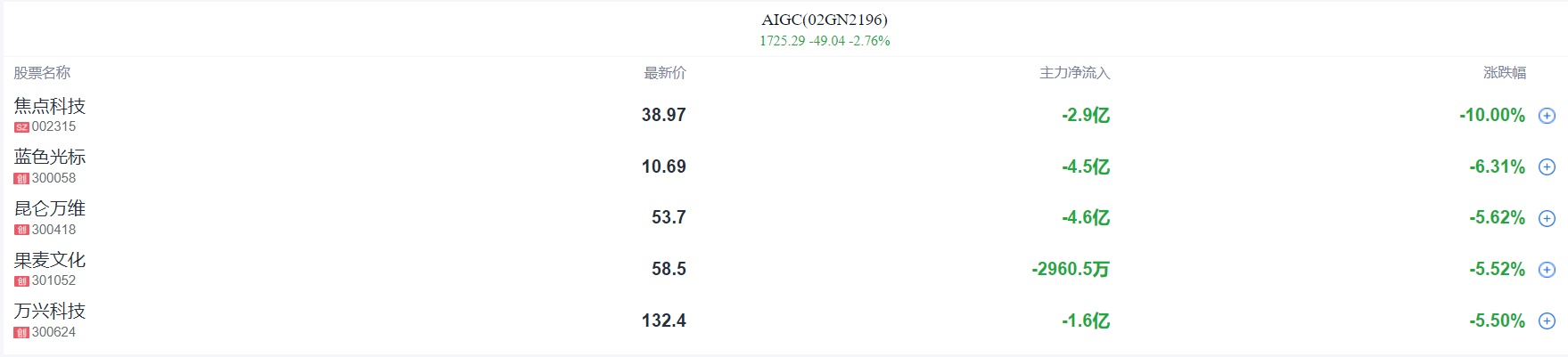 AI应用方向集体调整,浙文影业跌停,焦点科技、中视传媒等大跌。