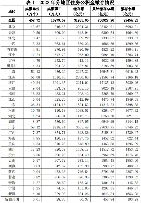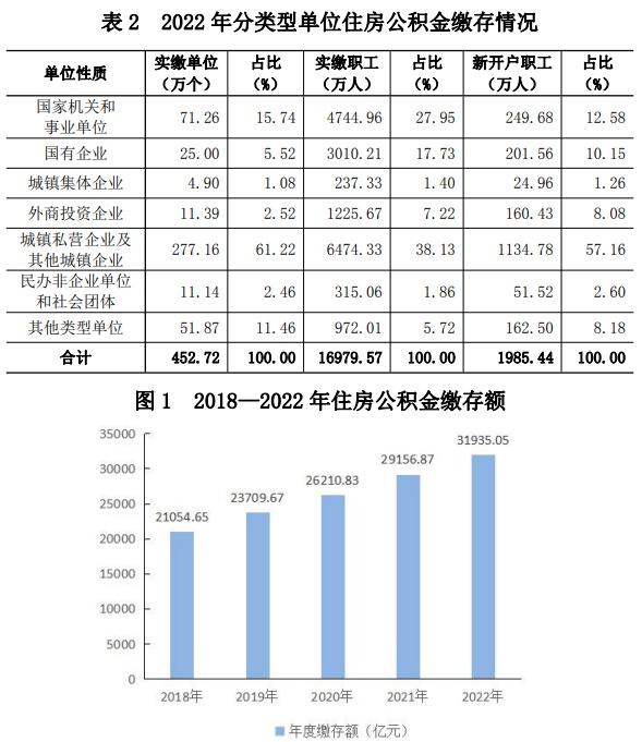 (一)缴存。2022年,住房公积金实缴单位452.72万个,实缴职工16979.57万人,分别比上年增长8.80%和3.31%。新开户单位75.22万个,新开户职工1985.44万人。2022年,住房公积金缴存额31935.05亿元,比上年增长9.53%。