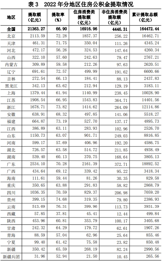 (二)提取。2022年,住房公积金提取人数6782.63万人,占实缴职工人数的39.95%;提取额21363.27亿元,比上年增长5.15%;提取率66.90%,比上年降低2.78个百分点。