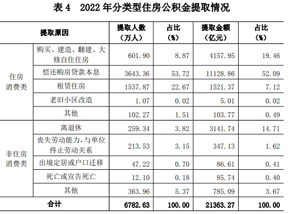 3.离退休等提取。2022年,支持896.15万人因离退休等原因提取住房公积金,共计4446.31亿元。