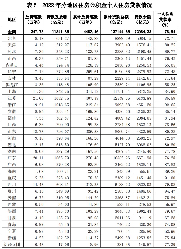 截至2022年末,累计发放住房公积金个人住房贷款4482.46万笔、137144.66亿元,分别比上年末增长5.85%和9.45%;个人住房贷款余额72984.33亿元,比上年末增长5.88%;个人住房贷款率78.94%,比上年末减少5.24个百分点。