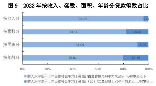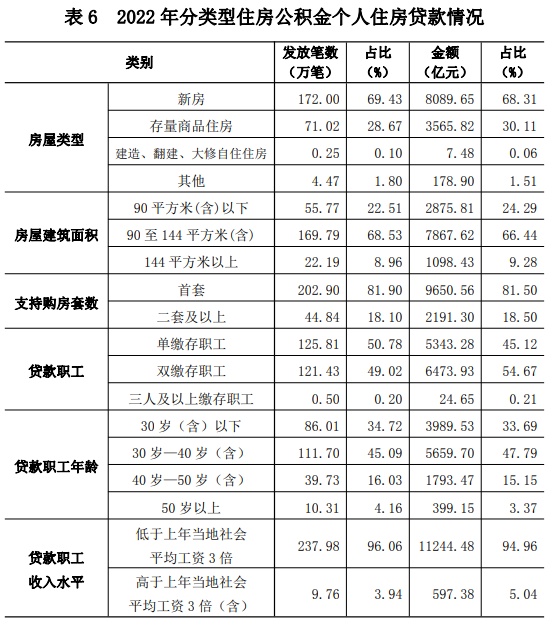 个人住房贷款重点支持首套普通住房。2022年发放的个人住房贷款笔数中,首套住房贷款占81.90%,144平方米(含)以下住房贷款占91.04%,40岁(含)以下职工贷款占79.81%。2022年末,住房公积金个人住房贷款市场占有率15.83%。