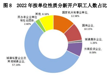 新开户职工中,城镇私营企业及其他城镇企业、外商投资企业、民办非企业单位和社会团体,以及其他类型单位的职工占比达76.02%;非本市职工1192.21万人,占全部新开户职工的60.05%。