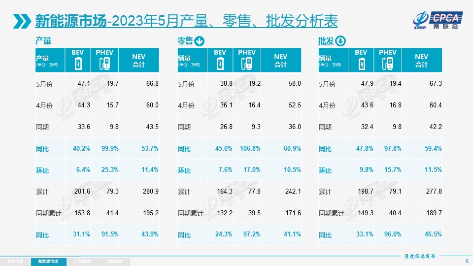 新能源:5月新能源乘用车批发销量达到67.3辆,同比增长59.4%,环比增长11.5%。今年以来累计批发277.8万辆,同比增长46.5%。5月新能源车市场零售58.0万辆,同比增长60.9%,环比增长10.5%。今年以来累计零售242.1万辆,同比增长41.1%。