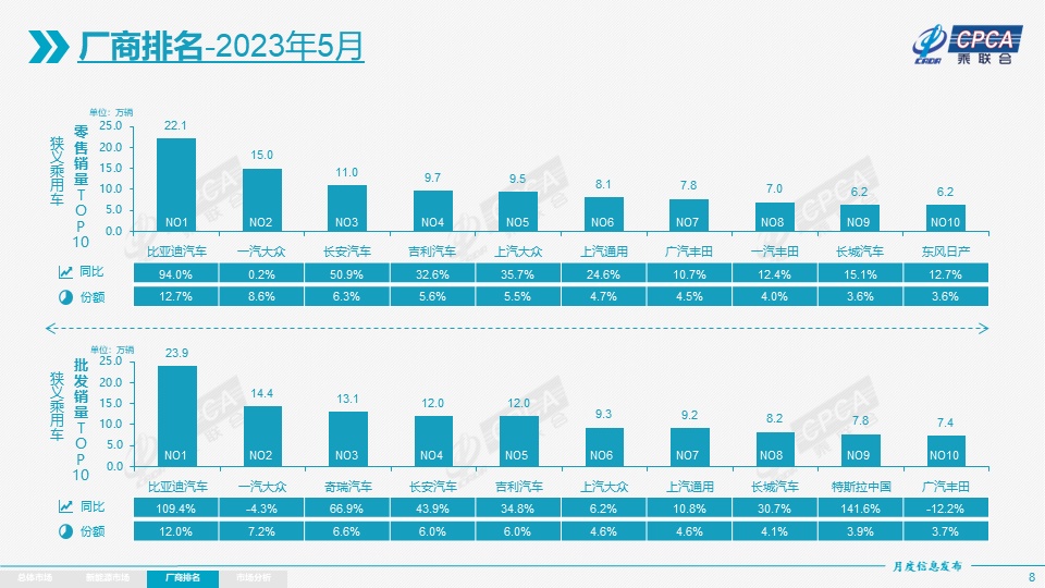 5月自主品牌零售87.0万辆,同比增长41.0%,环比增长11.0%。2023年5月自主品牌国内零售份额为50.3%,同比增长4个百分点;2023年自主品牌累计份额50.0%,相对于2022年同期增加3.5个百分点。5月自主品牌批发市场份额55.0%,较去年同期增5.2个百分点;自主品牌在新能源市场和出口市场获得明显增量,头部传统车企转型升级表现优异,比亚迪汽车(01211)、奇瑞汽车、长安汽车(000625.SZ)、吉利汽车(00175)等传统车企品牌份额提升明显。