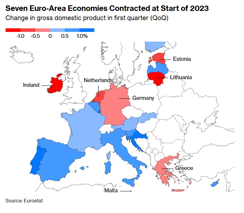 欧元区七个经济体在2023年初收缩——第一季度国内生产总值(GDP)变化