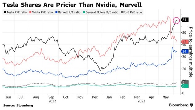 今年以来,特斯拉股价已上涨82%,预期市盈率约为61倍,而汽车巨头通用汽车和福特汽车的预期市盈率只有个位数左右。即便是目前人工智能领域的宠儿英伟达(NVDA.US)的预期市盈率也只有42倍。
