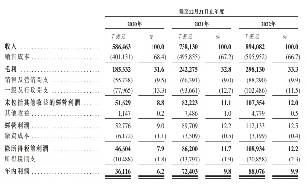 财务方面,截至2020年、2021年及2022年12月31日止年度,公司的收入分别为5.86亿美元、7.38亿美元及8.94亿美元,复合年均增长率为23.5%;年内利润分别为3611.6万美元、7240.3万美元及8807.6万美元,复合年均增长率为56.2%。