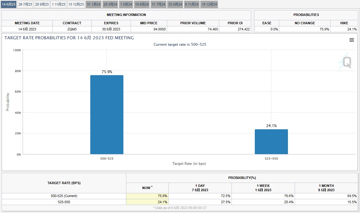 市场对美联储即将暂停加息的乐观预期推动美股走高。交易员们越来越多地押注美联储将在今年结束加息行动,甚至押注可能于今年降息(尽管美联储官员几乎没有释放出任何降息的信号)。CME的联储观察工具显示,市场认为美联储在下周的政策会议上暂停加息的可能性约为76%。
