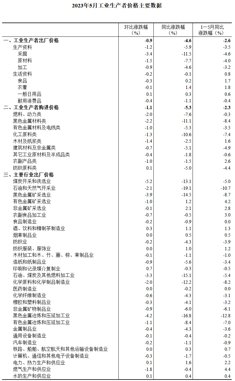 2023年5月份工业生产者出厂价格同比下降4.6% 环比下降0.9%