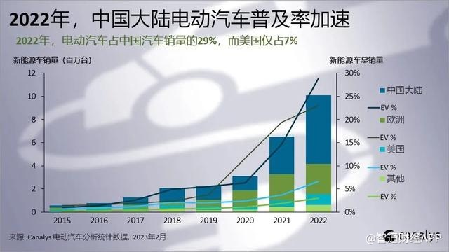 在低迷的车市中,新能源车的异军突起成为一抹亮色。据Canalys研究报告称,2022年全球新能源车(EV)年增长55%,达1010万辆,且中国大陆成为最大的新能源市场,2022年59%的新能源车销售来自中国。