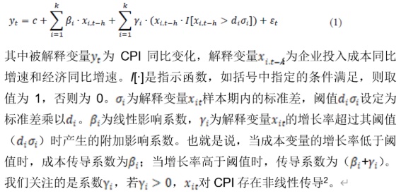 之前已有研究分析企业输入成本(如原油价格和汇率)与CPI之间的关系,其中多数研究在实证模型中假定成本变化与CPI通胀之间存在线性关系(Campa & Goldberg,2005)。在近期全球高通胀背景下,通胀的非线性动态引起了经济学家和政策制定者的关注,从货币政策实施的角度来看,这也是非常值得关注的问题之一(Taylor, 2000;BIS, 2022:Borio等, 2023;Gopinath, 2023)。