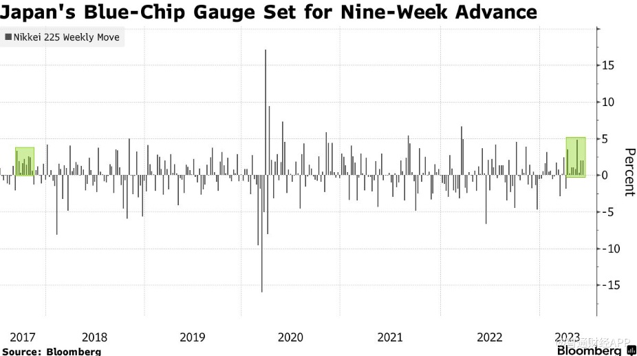 智通财经APP获悉,日经225指数势将连涨九周,这将是该指数逾五年以来最长的连续上涨记录。自6月2日以来,日经225指数上涨了近2%,将4月7日以来的涨幅扩大至17%,标普500指数周四进入牛市,为日本股市的上涨势头增添了动力。根据交易所的数据,外国投资者在5月份共购买了2.4万亿日元(172亿美元)的日本股票,这是自2013年4月以来最多的一次。