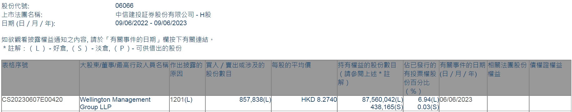 智通财经APP获悉,香港联交所最新资料显示,6月6日,Wellington Management Group LLP减持中信建投证券(06066)85.7838万股,每股作价8.2740港元,总金额约为709.78万港元。减持后最新持股数目约为8756万股,最新持股比例为6.94%。