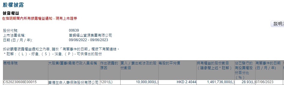 智通财经APP获悉,香港联交所最新资料显示,6月7日,富德生命人寿保险股份有限公司减持首钢资源(00639)1000万股,每股作价2.4044港元,总金额为2404.4万港元。减持后最新持股数目约为14.62亿股,最新持股比例为28.93%。
