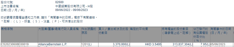 L.P.减持中国铝业(02600)337万股,每股作价3.5495港元,总金额约为1196.18万港元。减持后最新持股数目约为3.14亿股,最新持股比例为7.95%。