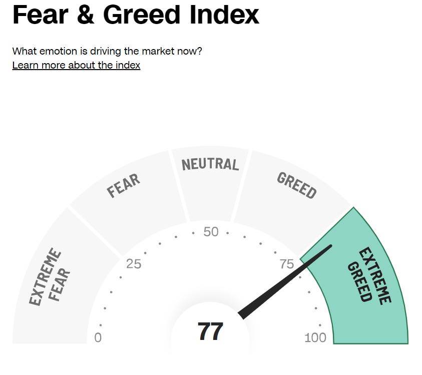 “CNN恐惧和贪婪指数”在过去一周一直徘徊在“贪婪”的区域,并在周四跃升至“极度贪婪”的区域区间,而AAII的每周投资者信心调查显示,在股市正式见顶之前,该指数竟然达到了近两年来的最高水平。