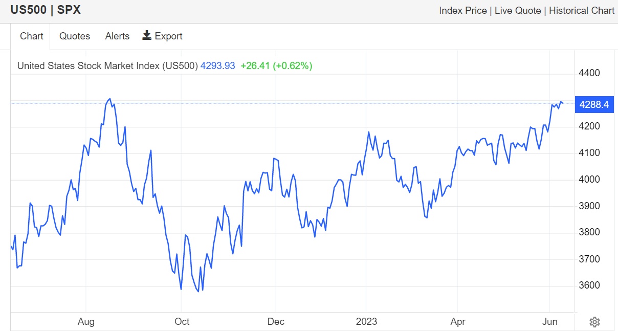 就在Vanda Research发布上述报告之际,美股基准指数——标普500指数周四正式迈入“技术性牛市”。截止当日收盘,标普500指数上涨26.41点,涨幅为0.62%,报4293.93点,自2022年10月份低点累计反弹了20%——这一数值为普遍意义上的牛市门槛。