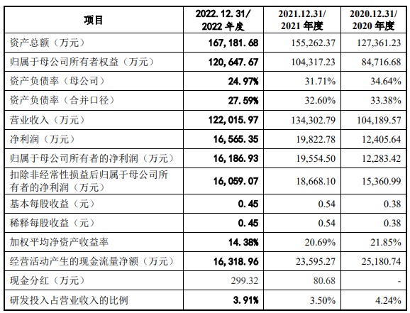 财务方面,于2020年度、2021年度及2022年度,公司实现营业收入分别约为10.42亿元、13.43亿元及12.20亿元。公司净利润分别约为1.24亿元、1.98亿元及1.66亿元人民币。