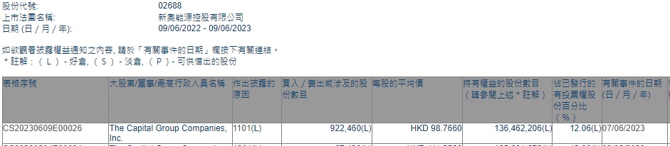 智通财经APP获悉,香港联交所最新资料显示,6月7日,美国资本集团增持新奥能源(02688)92.246万股,每股作价98.7660港元,总金额约为9110.77万港元。增持后最新持股数目约为1.36亿股,最新持股比例为12.06%。