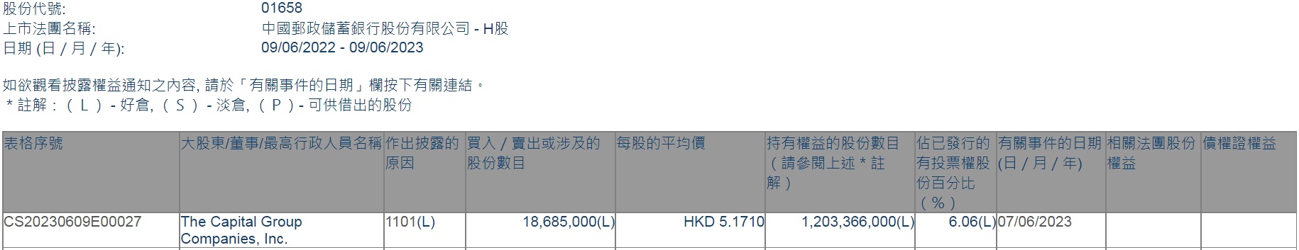 智通财经APP获悉,香港联交所最新资料显示,6月7日,美国资本集团增持邮储银行(01658)1868.5万股,每股作价5.171港元,总金额约为9662.01万港元。增持后最新持股数目约为12.03亿股,最新持股比例为6.06%。
