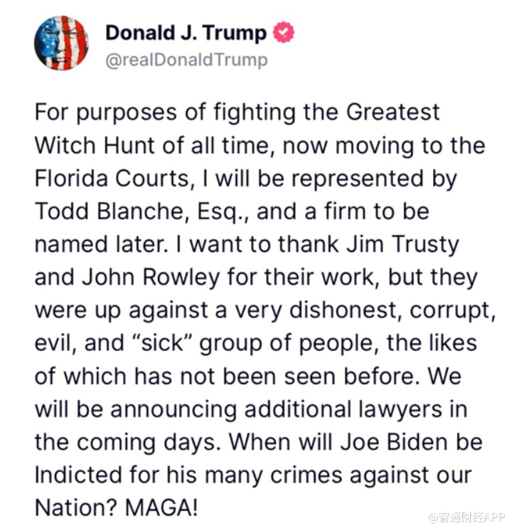在Truth Social平台上,特朗普表示,感谢Jim Trusty和John Rowley的工作,但他们面对的是“极度不诚实、腐败、邪恶和‘有病’的团伙”,这种情况以前从来没出现过。