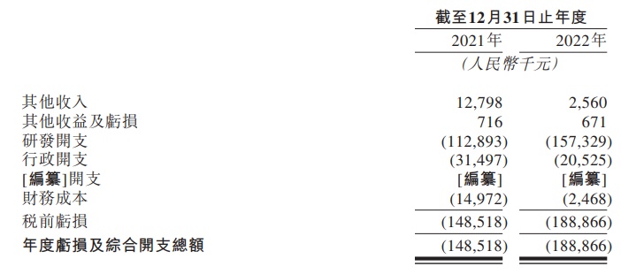 财务方面,于2021年及2022年,该公司实现其他收入分别约1279.8万元(人民币,下同)及256万元,录得亏损及综合开支总额人民币约1.49亿元及人民币1.89亿元。
