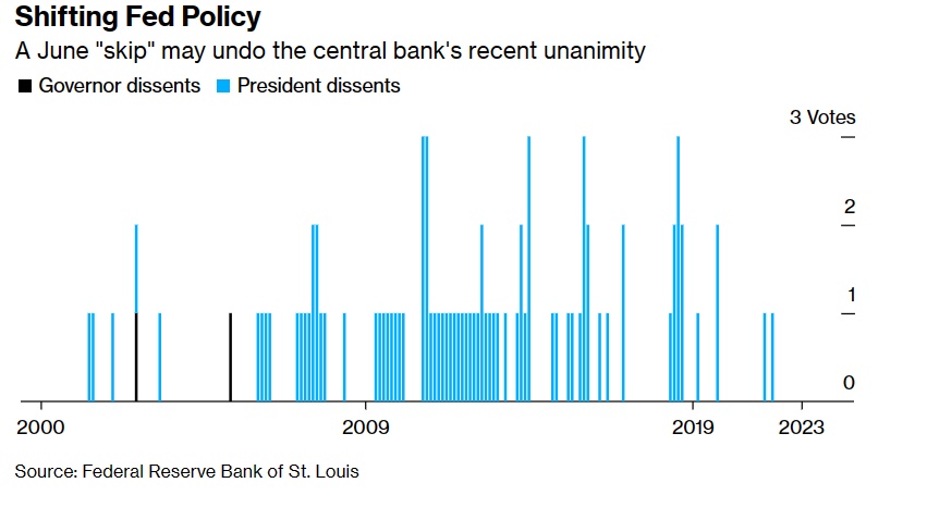 美联储官员最近的投票结果趋于一致,除了去年有两次单独的反对意见,而且在谈到降低通胀的承诺时,他们经常用类似的方式。但是,6月的“跳过加息”预期可能破坏美联储最近趋于一致的政策意见。