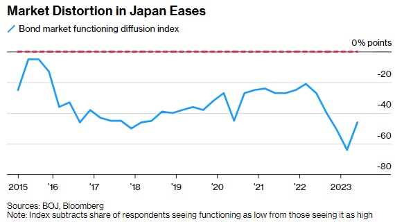 日本央行本月对银行和投资者的调查显示,自2月触及纪录低点以来,日本国债市场运作有所改善。日本央行去年12月出人意料地决定提高指标收益率上限,收益率曲线扭曲和流动性不足是背后的关键因素,此举引发了市场对更多变化即将到来的猜测。